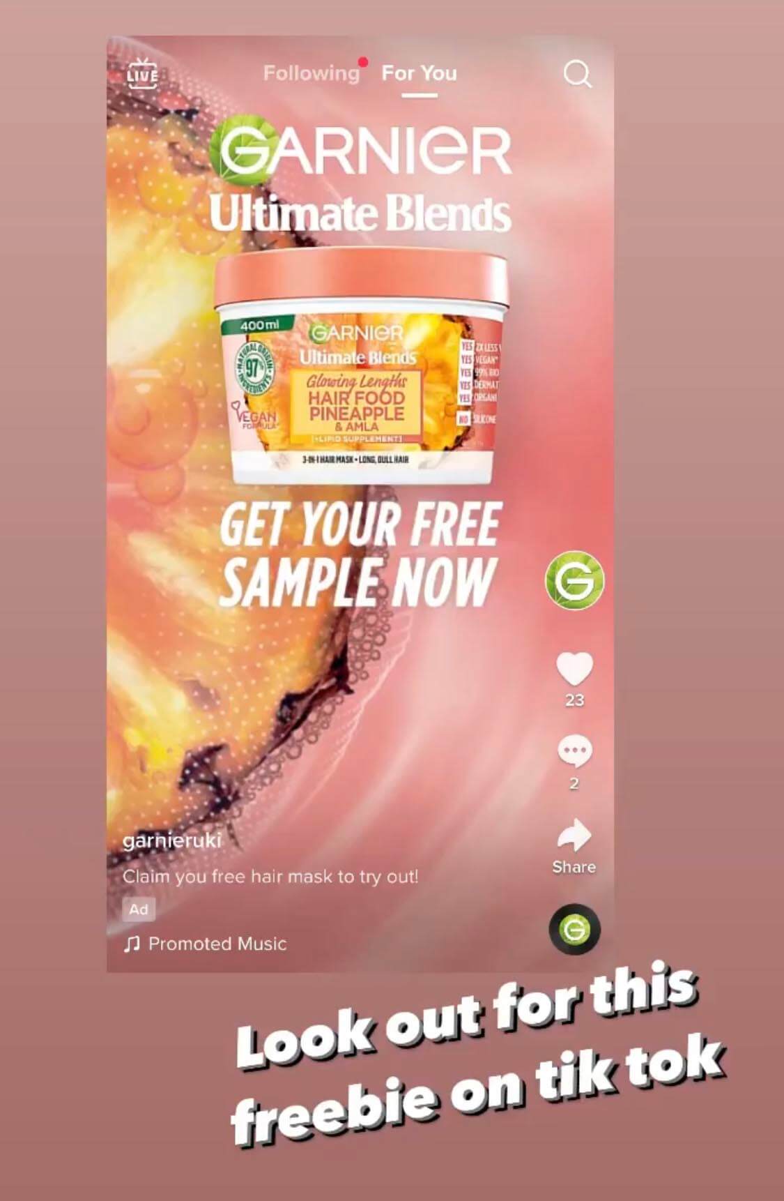 You can follow Garnier page on TikTok which may help show in your newsfeed. Get Freebie